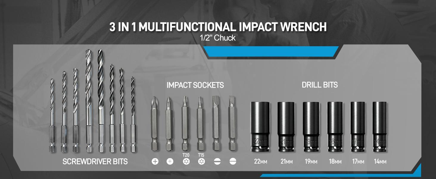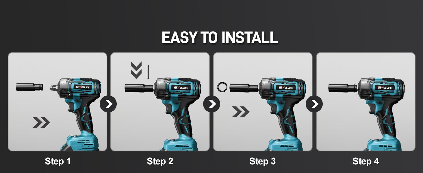 【What You Will Get】The Geveelife impact wrench set includes the 1/2" Cordless Impact Wrench, two 4.0Ah lithium-ion batteries, a fast charger, six impact sockets (14mm, 17mm, 18mm, 19mm, 21mm, 22mm), six Screwdriver Bits, eight Drill Bits, one O-ring & fixed pin, a toolbox, and a user manual. We also offer satisfactory after-sales service to ensure your utmost satisfaction.Electric impact gun.